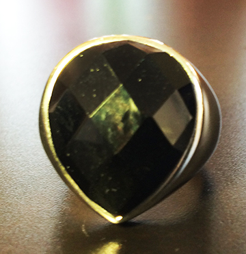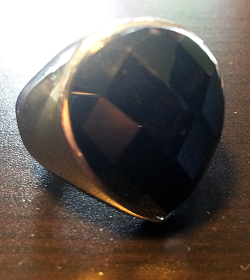 Pear-shaped, faceted black onyx set in gleaming stainless steel.